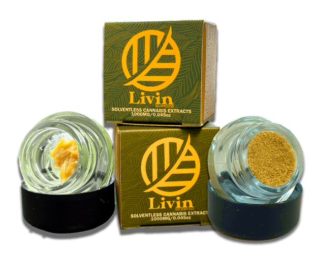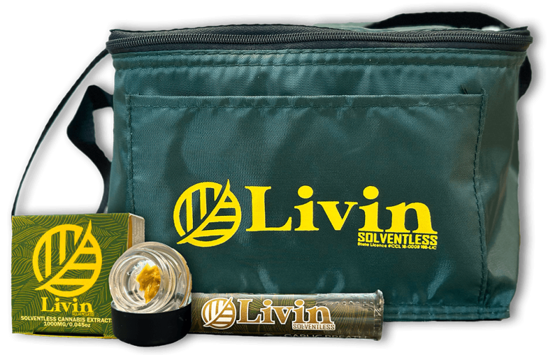 Livin is our Solventless line of products. This in-house brand uses Fresh Frozen flower for our rosins and dried flower for our bubble hash. The flower comes from Pacific Reserve and Rio Vista Farms. Then, it is put through a solventless extraction process resulting in high-quality concentrates. Due to our vertical integration, these solventless concentrates won’t be costly. Livin is true, From The Ground Up.